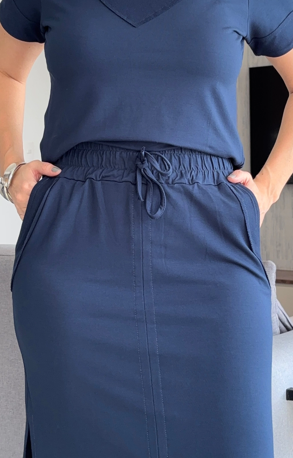 A saia midi com fenda frontal e cós elástico garante liberdade e elegância